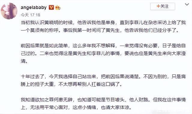 她首先发难,发表一篇小作文,开口就称“黄先生”! 关于她和李菲儿之间的梁子,她直言“我不是小三,这口锅我背太久了”,言下之意,是黄晓明欺骗在先。
