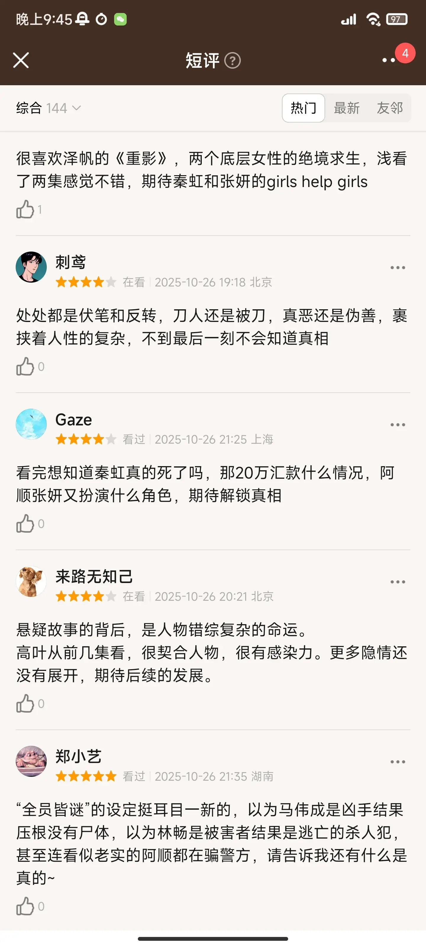 首播口碑也出来了,大部分观众都给出了好评,理由出奇一致,就是够悬疑,根本猜不透。通过一件杀人抛尸案引出一段错综复杂、扣人心弦的情感故事。社会推理派手法,聚焦女性复仇的罪案,层层剥开的是杀人动机和现实社会问题。除了案件本身,人性也有很大看点啊!